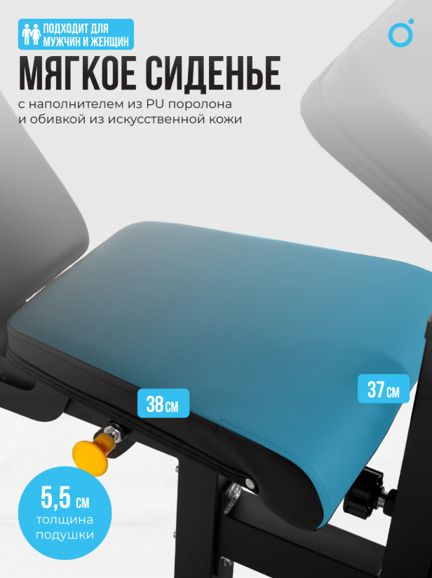 Силовая скамья OXYGEN FITNESS HOLTON — это идеальный тренажер, который позволяет нагружать основные группы мышц: руки, грудь, плечи, торс и ноги. Компактные размеры в рабочем состоянии (длина206 см, ширина51 см, высота129 см) делают ее удобной для размещения в любом помещении. Прочная рама с толщиной профиля2 ммобеспечивает надежность и стабильность во время тренировок. Скамья предназначена для выполнения разнообразных упражнений, включая жим лежа, разгибание ног, тренировки на бицепс и многое другое. Эргономичное сиденье с наполнителем из PU поролона и обивкой из искусственной кожи обеспечивает комфорт во время занятий. Возможность регулировки положения сиденья и спинки (14 уровней для спинки и 3 уровня для сиденья) позволяет адаптировать скамью под индивидуальные параметры пользователя, что делает тренировки более эффективными. Силовая скамья OXYGEN FITNESS HOLTON оснащена всеми необходимыми элементами для полноценной тренировки. В комплекте имеется штырь для дисков диаметром50 мми замок для дисков, что обеспечивает надежную фиксацию веса. Бицепс-рукоятка и 4 неопреновых валика добавляют дополнительные возможности для тренировки и повышают комфорт. Также скамья оснащена транспортировочными роликами, что облегчает перемещение и хранение. Ключевые преимущества OXYGEN FITNESS HOLTON: • многофункциональность: возможность тренировки различных групп мышц, включая руки, грудь, плечи и ноги; • комфорт и поддержка: эргономичное сиденье и многоуровневая регулировка обеспечивают удобство и поддержку во время тренировок; • надежная конструкция: прочный профиль рамы обеспечивает долговечность и стабильность скамьи.