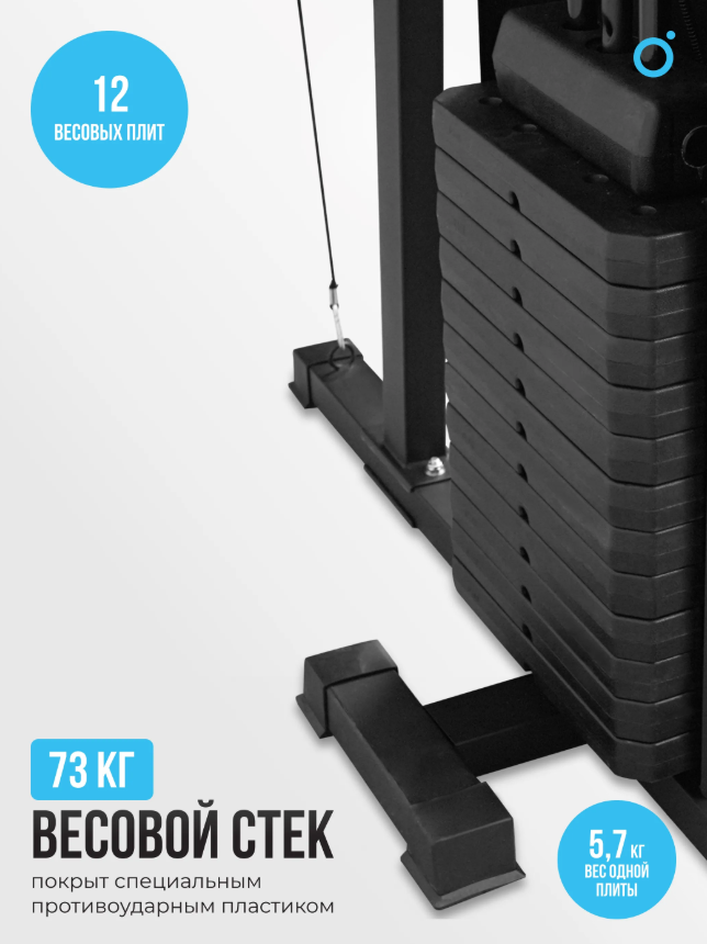 Силовой комплекс OXYGEN FITNESS SITKOR — это идеальное решение для тех, кто стремится к разнообразным тренировкам и эффективным результатам. Он сочетает в себе множество функций, позволяя пользователю прорабатывать все группы мышц. Система включает в себя турник, брусья, скамью, боксерскую грушу и многое другое, что делает его универсальным инструментом для занятий как для новичков, так и для опытных спортсменов. Силовой комплекс имеет компактные размеры: в рабочем состоянии его длина составляет 220 см, ширина — 210 см, а высота — 227 см. Общий вес комплекса составляет 225 кг, что обеспечивает устойчивость и безопасность даже при максимальной нагрузке. Максимальный вес пользователя, который может тренироваться на данном комплексе, составляет 200 кг, что делает его идеальным для большинства атлетов. В OXYGEN FITNESS SITKOR предусмотрено использование качественных материалов. Подвесной мешок, выполненный из экокожи, весит 18-20 кг и дает новые возможности для кардио тренировок. Подушки и сиденья имеют оптимальные размеры для удобства: спинка — 22.5х39х6 см, подлокотники — 34.5х1х56 см, а скамья для пресса — 42х32х6 см. Наличие неопреновых валиков гарантирует дополнительный комфорт и защиту. Ключевые преимущества OXYGEN FITNESS SITKOR: • полукоммерческое назначение, подходит как для домашних тренировок, так и для небольших фитнес-залов; • универсальность: позволяет выполнять широкий спектр упражнений для всех групп мышц; • высокая нагрузка: вес стека в 73 кг с 12 плитами по 5.7 кг каждая.