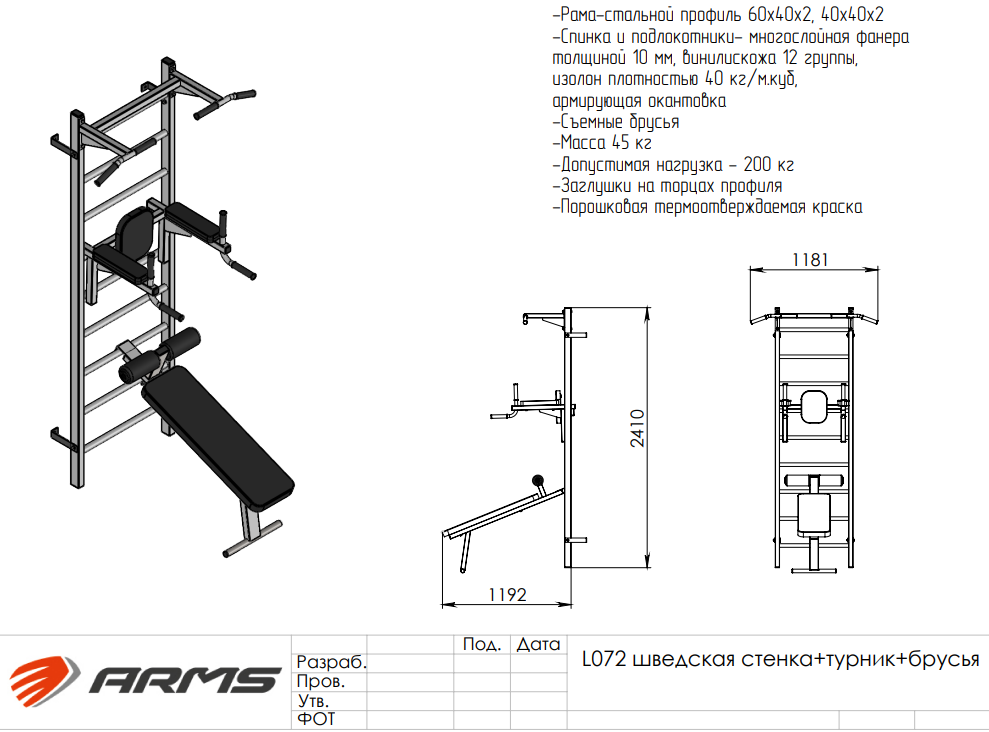 купить Многофункциональный комплекс Шведская стенка турник брусья скамья для пресса ARMS L072-1 екатеринбургспорт