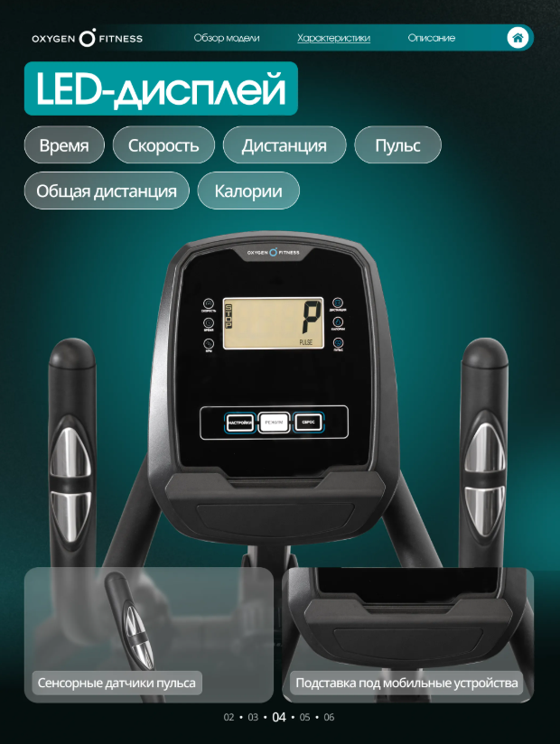 Тренажёр построен на высокопрочной раме с антикоррозийной обработкой и двухслойной покраской, что обеспечивает устойчивость и долговечность конструкции. Корпус выполнен из ударопрочного полистирола HIPS, устойчивого к износу. Передний привод и инерционный вес маховика24 кг(BioFusion™) обеспечивают ровное, стабильное и естественное движение без рывков. Реальный вес маховика составляет6 кг. Длина шага460 ммподходит для большинства пользователей и позволяет поддерживать комфортную амплитуду движения. Расстояние между педалями — всего80 мм, что снижает нагрузку на колени и тазобедренные суставы. Педальный узел с трёхкомпонентным шатуном повышает надёжность и ресурс тренажёра, а увеличенные антискользящие педали обеспечивают уверенную фиксацию стопы. ALAMOSA использует магнитную систему нагружения с 10 уровнями сопротивления, регулируемыми механически. Это позволяет легко подобрать интенсивность тренировки — от лёгкой кардионагрузки до более энергичных занятий. Тренажёр не требует подключения к электросети, что упрощает установку и эксплуатацию в домашних условиях. Консоль оснащена монохромным LED-дисплеем и отображает основные параметры тренировки: • время, • скорость, • дистанция, • калории, • пульс, • общую дистанцию. Доступные режимы: быстрый старт и ручной режим. Интерфейс поддерживает русский и английский языки. Для контроля сердечного ритма предусмотрены сенсорные датчики пульса на поручнях. Рукоятки двухпозиционные, с нескользящим покрытием. OXYGEN FITNESS ALAMOSA - сбалансированный эллиптический тренажёр для домашних тренировок, сочетающий плавность хода, надёжную конструкцию и комфортную биомеханику для ежедневной работы над выносливостью и формой.