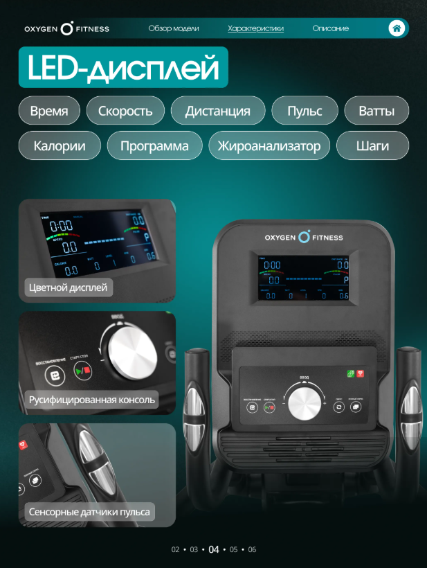 Тренажёр построен на высокопрочной раме с антикоррозийной обработкой и двухслойной покраской, что обеспечивает устойчивость и долговечность конструкции. Корпус выполнен из ударопрочного полистирола HIPS, устойчивого к механическим нагрузкам и износу. Ключевые параметры движения: • Инерционный вес маховика24 кг(BioFusion™) при реальном весе6 кг— ровный и стабильный ход без рывков. • Длина шага460 мм— комфортная амплитуда движения для пользователей разного уровня подготовки. • Расстояние между педалями80 мм— устойчивое и безопасное положение ног. • Трёхкомпонентный шатун — повышенная надёжность и ресурс педального узла. Увеличенные антискользящие педали обеспечивают уверенную фиксацию стопы, а двухпозиционные рукоятки позволяют задействовать мышцы верхней части тела. OXYGEN FITNESS SONOMA оснащён электромагнитной системой нагружения с 16 уровнями сопротивления, регулируемыми электронно. Это позволяет точно подбирать интенсивность тренировки и плавно менять нагрузку в процессе занятия. Цветная LED-консоль отображает расширенный набор тренировочных показателей: • время, скорость, дистанцию, • калории и пульс, • программу, Ватты, • жироанализатор и количество шагов. Программный пакет включает 20 режимов тренировок: • быстрый старт и ручной режим, • 10 предустановленных программ, • 4 пульсозависимые программы, • 4 пользовательские программы, • режим работы по Ваттам и жироанализатор. Для более точного контроля пульса предусмотрены сенсорные датчики на поручнях, а также возможность подключения Bluetooth-кардиодатчика (приобретается отдельно). Тренажёр поддерживает Bluetooth-подключение к популярным приложениям Kinomap™ и Zwift™ с интерактивным уровнем интеграции, что делает тренировки более вовлекающими и разнообразными. Дополнительные элементы комфорта: • подставка под планшет или смартфон, • подставка для бутылки, • удлинённый сетевой шнур4 м, • транспортировочные ролики и компенсаторы неровностей пола. Интерфейс доступен на русском и английском языках. Тренажёр работает от сети 220 В и рассчитан на пользователей весом до150 кг. OXYGEN FITNESS SONOMA — сбалансированный эллиптический тренажёр для дома, который объединяет комфортную биомеханику, современные технологии и функциональность, необходимую для эффективных и разнообразных кардиотренировок.