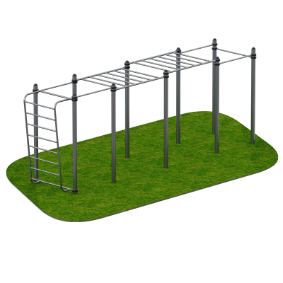 Основу комплекса составляют стальные стойки из трубы диаметром 108 мм с толщиной стенки 4 мм. Конструкция рассчитана на интенсивную эксплуатацию и устойчивость к динамическим нагрузкам. В отдельных элементах могут применяться стойки диаметром 89 мм с толщиной стенки 3 мм, что оптимизирует конструкцию без потери прочности. Верхние части стоек оснащены сферическими пластиковыми заглушками, предотвращающими попадание влаги внутрь трубы.